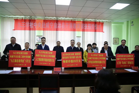 在九三中学,社省委会一行参加了社中央组织的教育帮扶捐赠仪式,见证了浙江社组织与社员的爱心善举。社员企业杭州遥望网络科技有限公司启动“关爱女学生生理健康”威宁公益行动,捐赠价值20万元的“朵薇”卫生巾;浙江九三企业发展促进会常务副会长、浙江大合检测有限公司董事长何相礼向二塘中学捐赠第7年“九三励志奖学金”5万元;企业发展促进会副会长、杭州华浙建设科技有限公司董事长来江向九三中学捐赠价值5万元的人工智能教学设备。